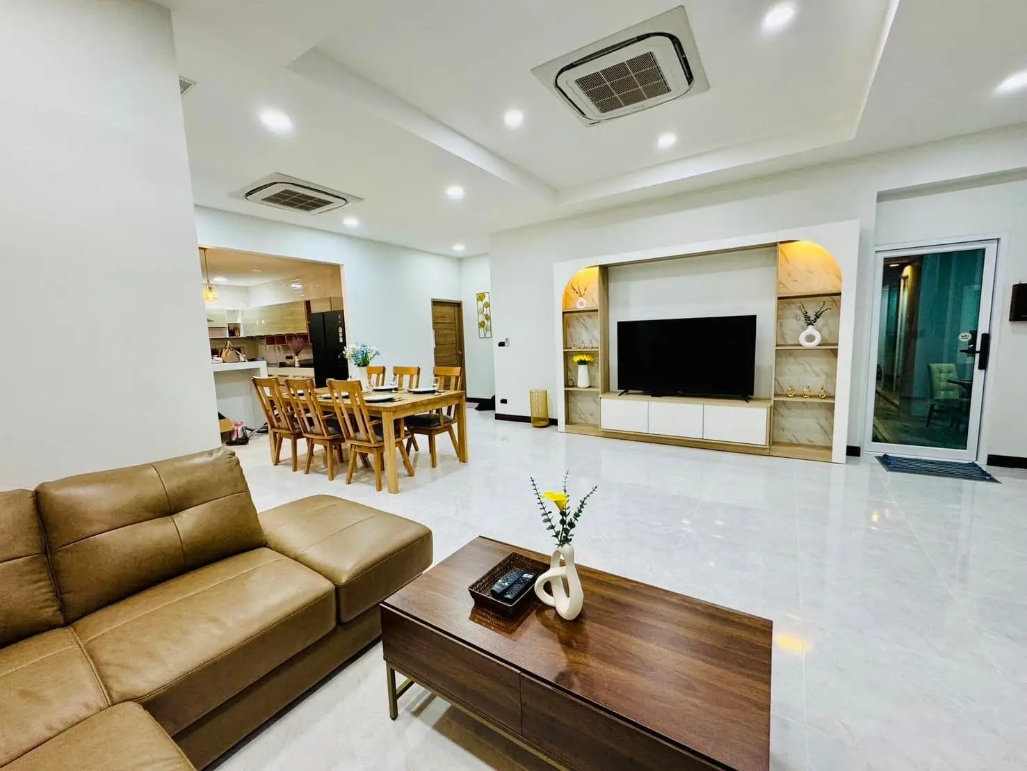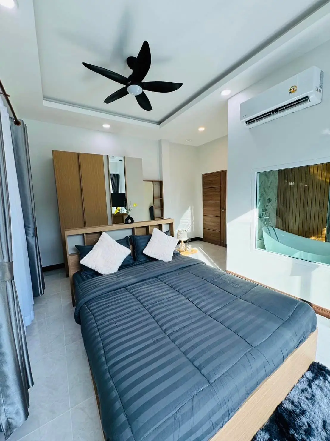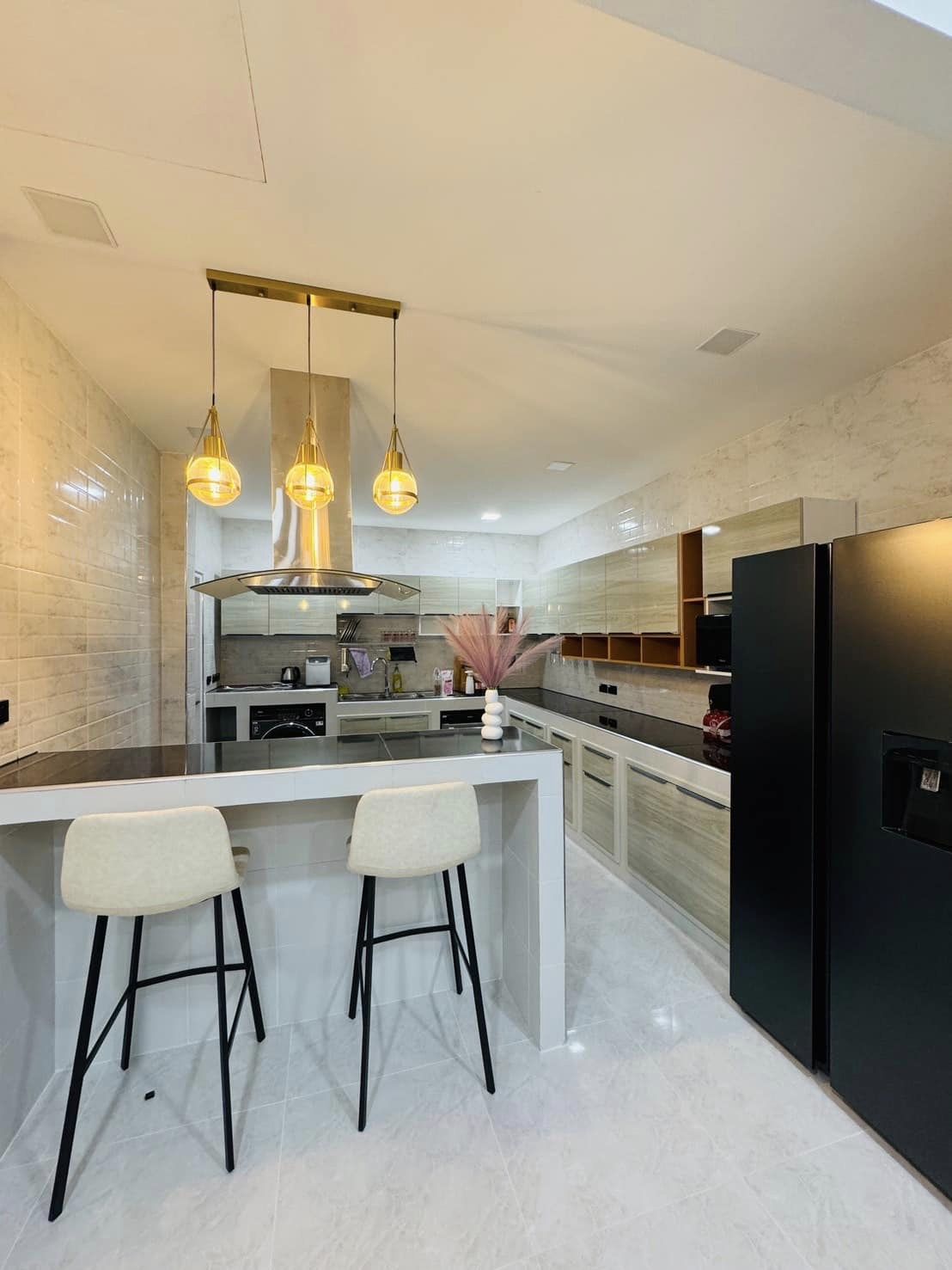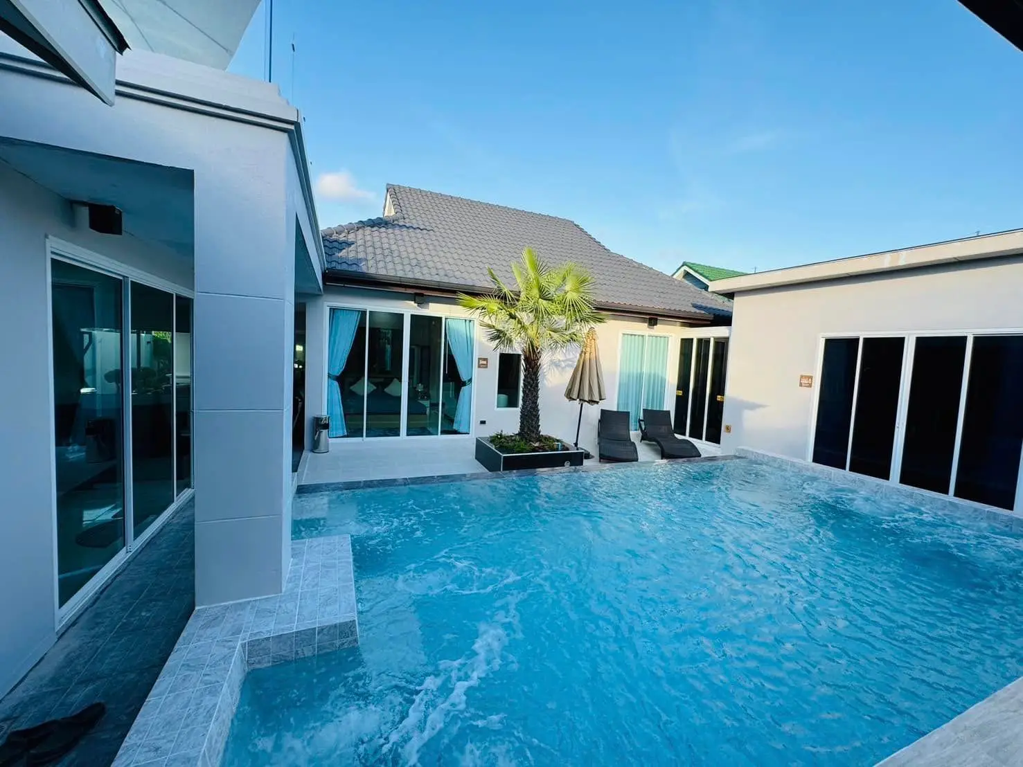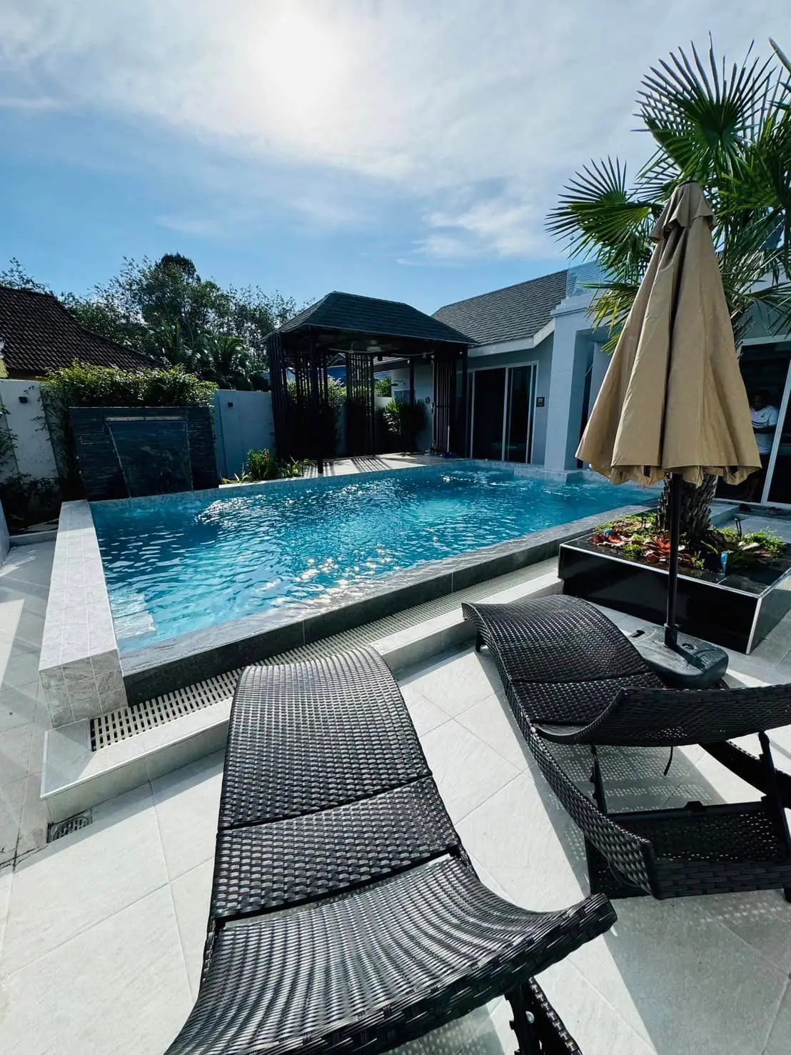 Luxury Villa for Rent in Thalang! This spacious villa features 4 bedrooms, 6 bathrooms (2 with bathtubs), a sauna, a stylish sky bar, and even a pet room, perfect for those with small pets. The home is equipped with a hot and cold water system throughout and has parking space for 1 car.