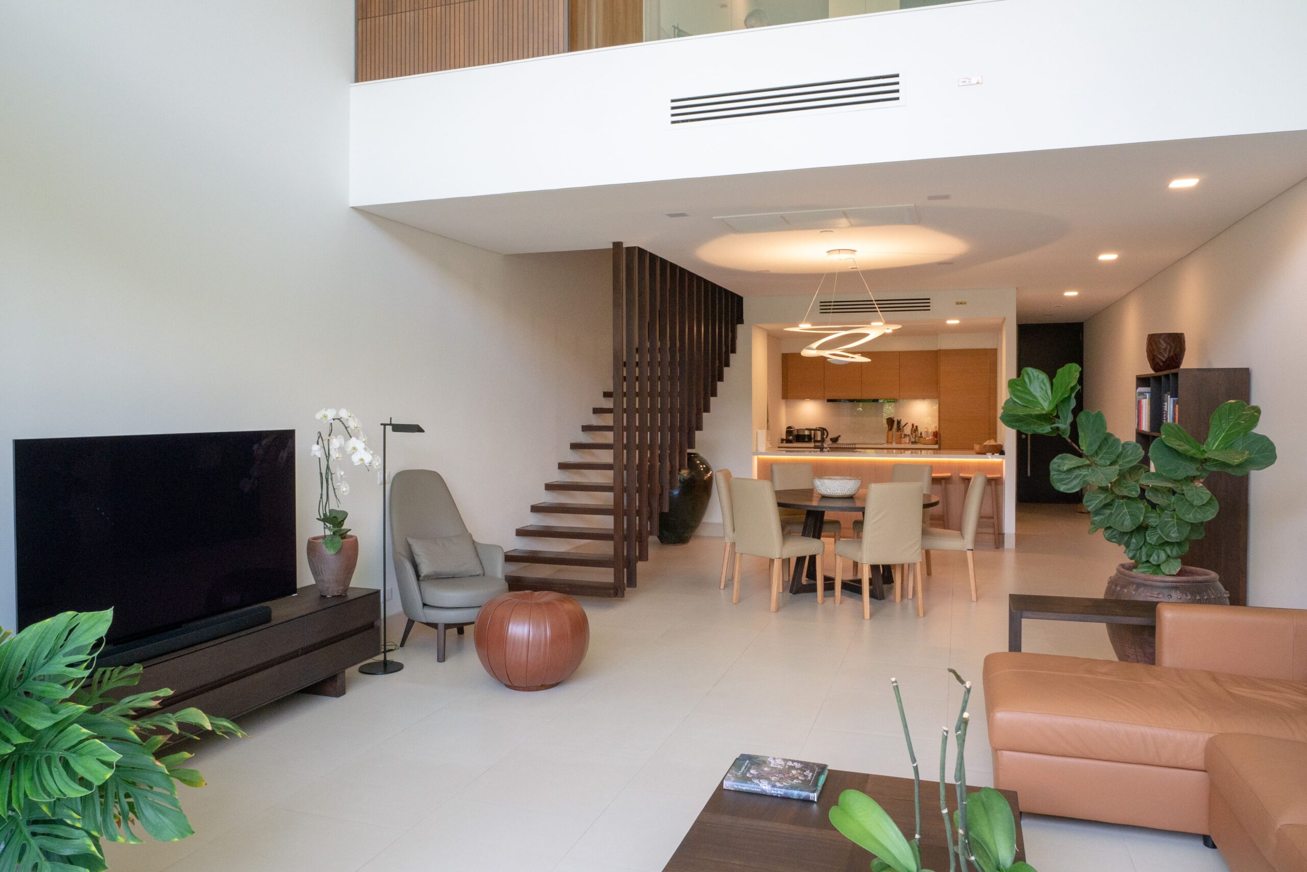 This 177 m² foreign freehold condo features two bedrooms upstairs sharing a large dual-access bathroom. The master suite offers garden and mountain views that create a calming retreat. The ground floor presents an open-plan living space with a soaring loft ceiling, seamlessly connecting the modern Kulk brand western kitchen—equipped with oak cabinetry, built-in appliances, and filtered water system—to a bright dining and lounge area. Step outside to a private terrace ideal for BBQs and al fresco dining, surrounded by tropical greenery.