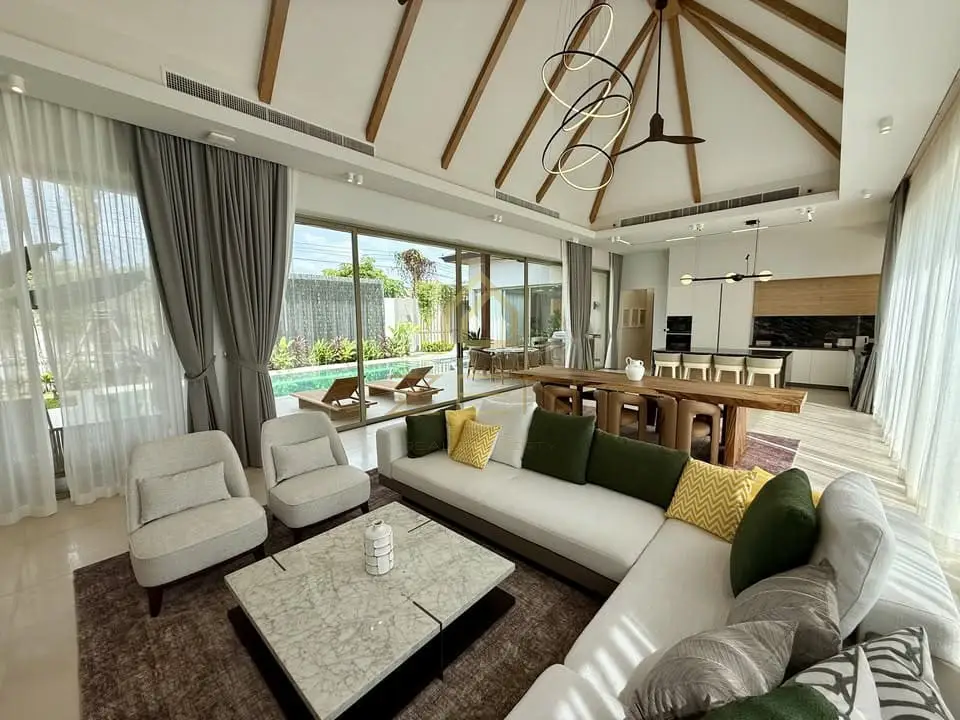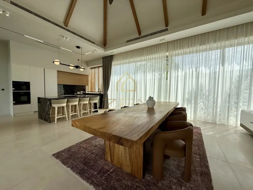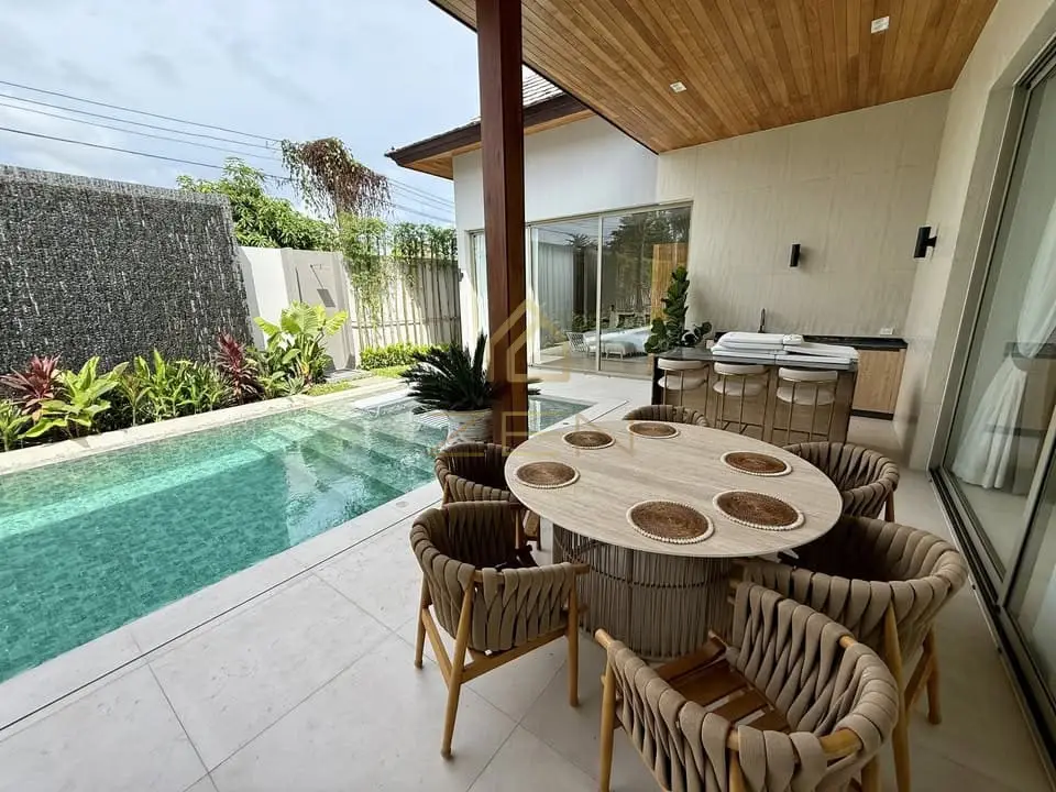 This 3-bedroom villa features bright open-plan living with high ceilings, full-height glass doors, a beautifully landscaped garden, and a private swimming pool with an integrated shallow sun deck — perfect for relaxing or working by the water. The outdoor area includes a covered lounge, pool shower, and a stylish built-in outdoor kitchen. Inside, the villa offers a spacious living room, a fully equipped modern kitchen, and three serene bedrooms designed for comfort and privacy. Located just minutes from Bang Tao Beach, Boat Avenue, Porto de Phuket, world-class restaurants, spas, gyms, and international schools, this home is ideal for families and long-term residents seeking comfort and convenience.