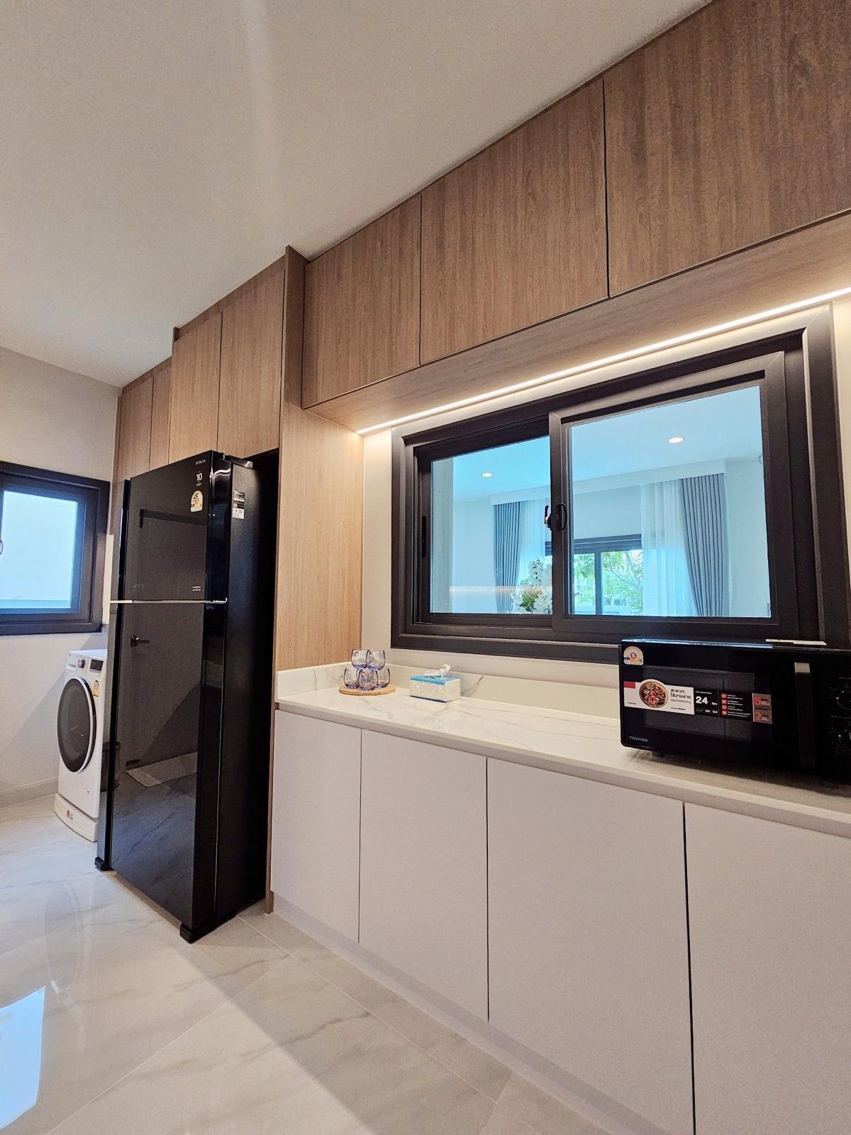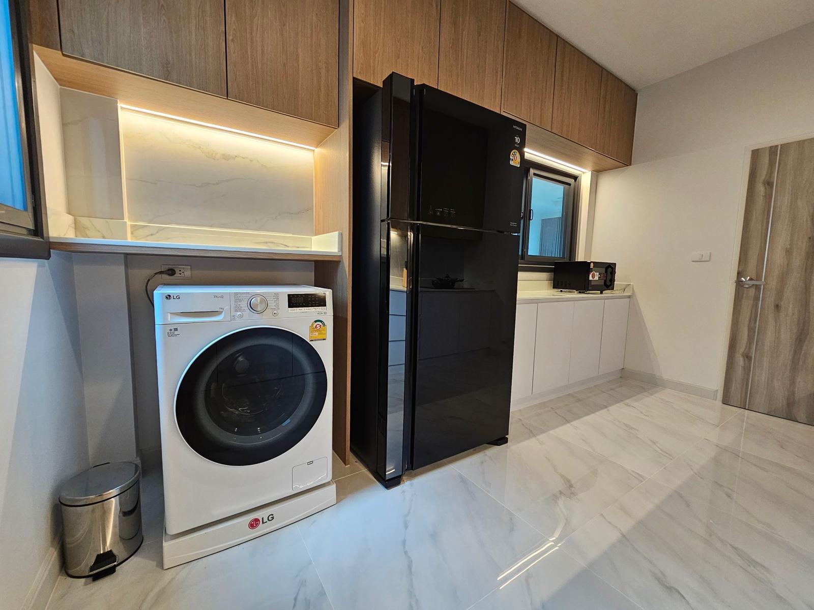 The villa spans 320 sq.m of living area on an 80 sq.w plot and includes a fully furnished interior with two living rooms, a dining area, a modern kitchen, and a separate laundry area. The layout features a well-designed garden, three parking spaces, and additional storage, making it a versatile choice for comfortable living. The kitchen comes equipped with a gas stove, oven, refrigerator, and exhaust hood, along with other essential appliances.
