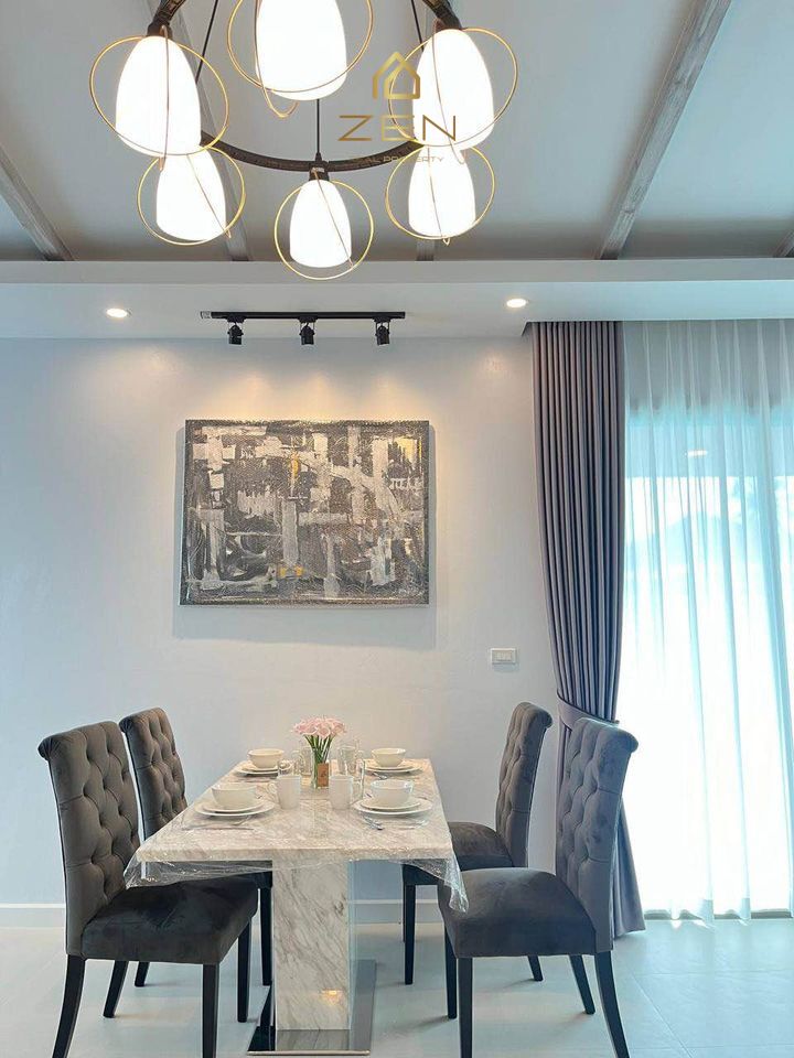 This stylish villa offers three bedrooms and four bathrooms, available for rent at 135,000 THB per month with a one-year contract. A two-month deposit is required. Pets are allowed on a case-by-case basis.